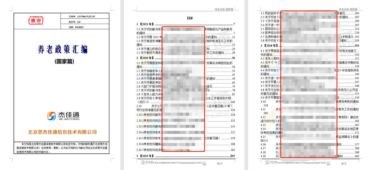 杰佳通在16年的智慧養老研發和建設中,不斷總結:如何讓養老運營單位少走彎路,快速實現盈利,除不斷完善《養老運營匯編》一書外,近期也編制了《養老政策匯編》系列書,分為國家篇和地方政府篇,其中國家篇一書,總頁數為八百多頁,供我們的合作伙伴參考。